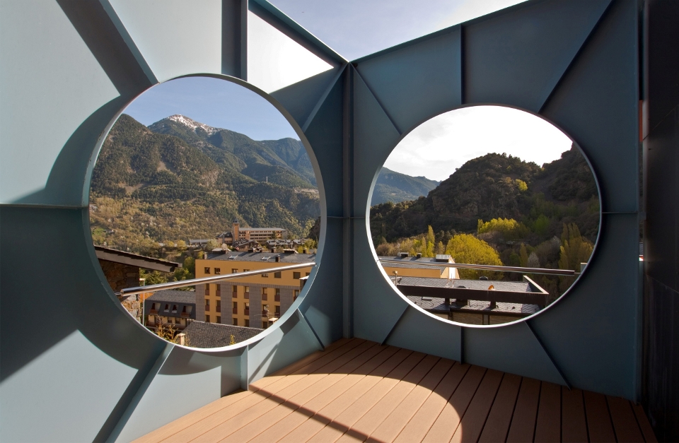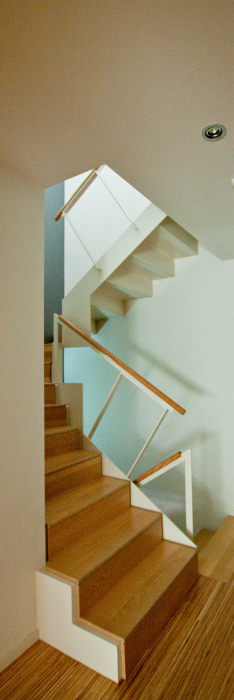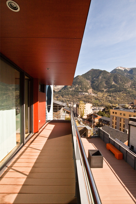 Per donar més amplitud a una planta interior de poca dimensió, s’ha compactat l’espai de circulacions verticals i es perllonga l’interior cap a l’exterior per mitjà de terrasses i balcons , protegits en part, que acompanyen i dilaten la transició del dins cap al fora.